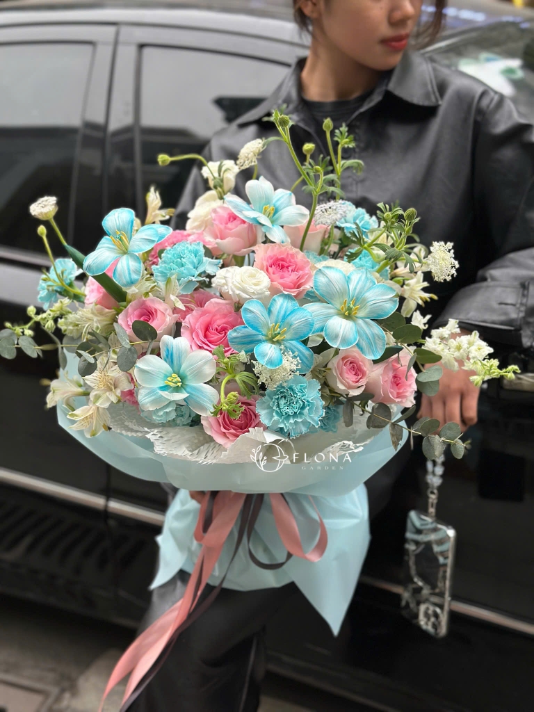 Aqua Melody – bản nhạc trong veo của sắc trời và hoa. Sắc xanh của Carnation (hoa cẩm chướng) và Lily (hoa loa kèn) hòa cùng hồng phấn của Rose (hoa hồng), mang đến cảm giác dịu dàng, thanh mát và đầy sức sống. Một bó hoa dành cho những ai yêu sự tươi sáng và tinh tế như buổi sớm mai trên mặt hồ.