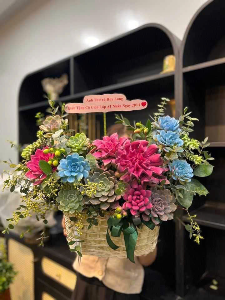Giỏ hoa mọng nước Aurora Grace là bản hòa tấu ngọt ngào của Echeveria (sen đá), Aeonium (sen cánh hồng), điểm sắc hồng ruby, xanh ngọc và lam dịu — tựa ánh bình minh khẽ chạm lên từng phiến lá. Được tô điểm bằng nhánh Hypericum (tùng trúc mai) và lá Eucalyptus (bạch đàn), giỏ hoa mang hơi thở thanh khiết, sang trọng, là món quà tinh tế dành tặng thầy cô, bạn bè hay những người bạn trân quý.