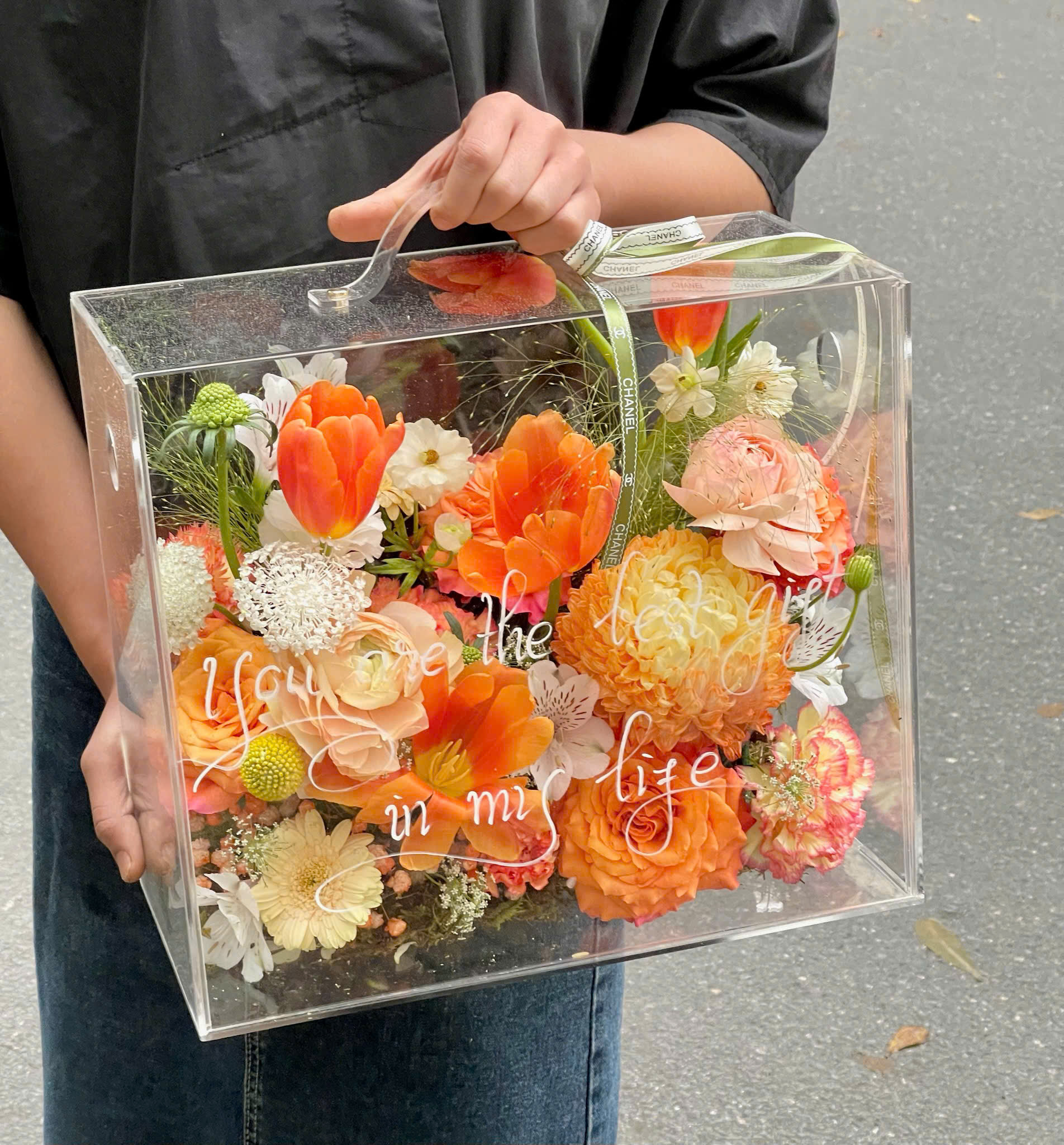 Rực rỡ và ấm áp như buổi sớm mùa thu, Tulip cam và Chrysanthemum (Hoa cúc mẫu đơn) hòa quyện trong sắc cam – vàng – kem thanh thoát. Mỗi cánh hoa như vệt nắng lấp lánh, khơi gợi niềm vui, năng lượng và những cảm xúc tươi sáng trong tim.