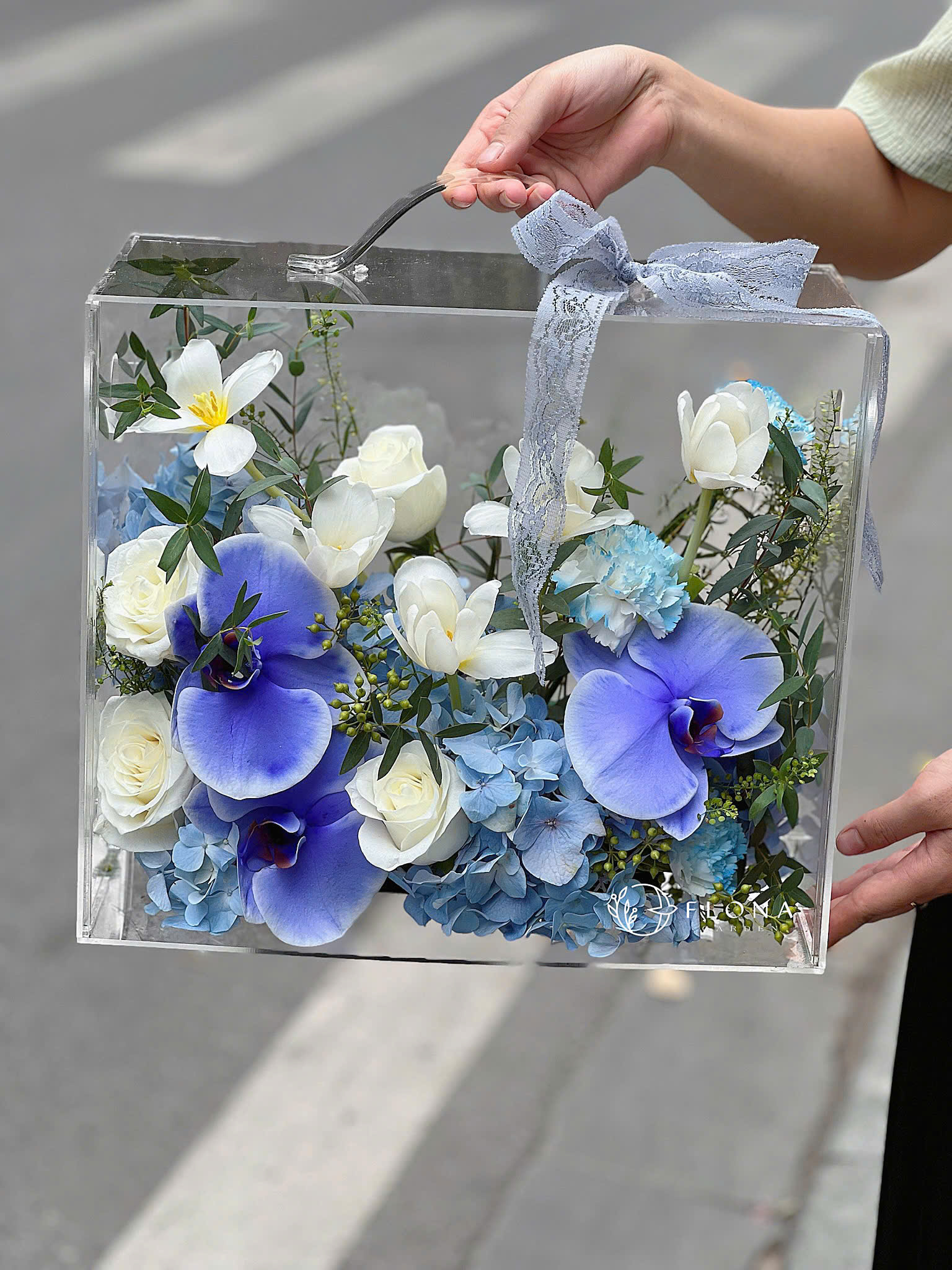 Khúc giao hòa của sắc Phalaenopsis (lan hồ điệp) tím hồng và Rose (hoa hồng) đỏ rực rỡ, ánh lên qua lớp mica trong suốt. Mỗi cánh hoa như phản chiếu niềm vui và ánh sáng, tạo nên một khu vườn lấp lánh – nơi tình yêu được nhìn thấy qua lăng kính sắc màu.