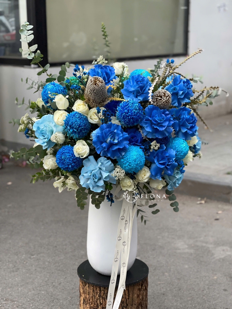 Azure Harmony – “Azure Harmony” là bản giao hưởng của sắc xanh thuần khiết – nơi những đóa hoa hồng xanh, cúc mẫu đơn xanh (chrysanthemum), hoa cát tường, banksia (ngân hoa Úc)eucalyptus (lá khuynh diệp) hòa mình vào nhau, mang lại cảm giác sâu lắng và an nhiên. Bình hoa như đại dương thu nhỏ, tỏa ra năng lượng tươi mới, sang trọng và đầy cảm hứng.