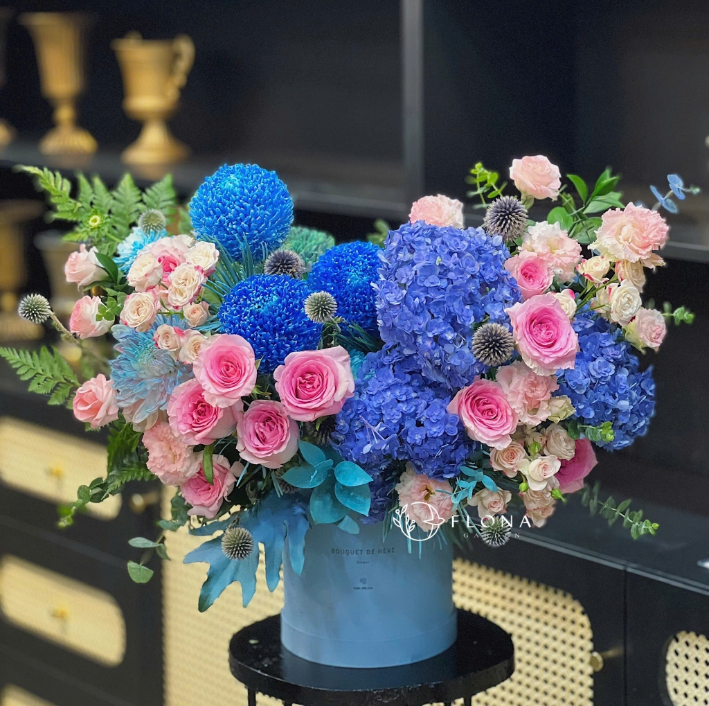 Tựa sắc trời trong veo sau cơn mưa sớm, Bleu de L’aube mang vẻ tươi mát của Hydrangea (cẩm tú cầu) hòa cùng nét ngọt ngào của Rose (hoa hồng). Hộp hoa như làn gió mỏng của bình minh, dịu dàng khẽ chạm đến trái tim người nhận.