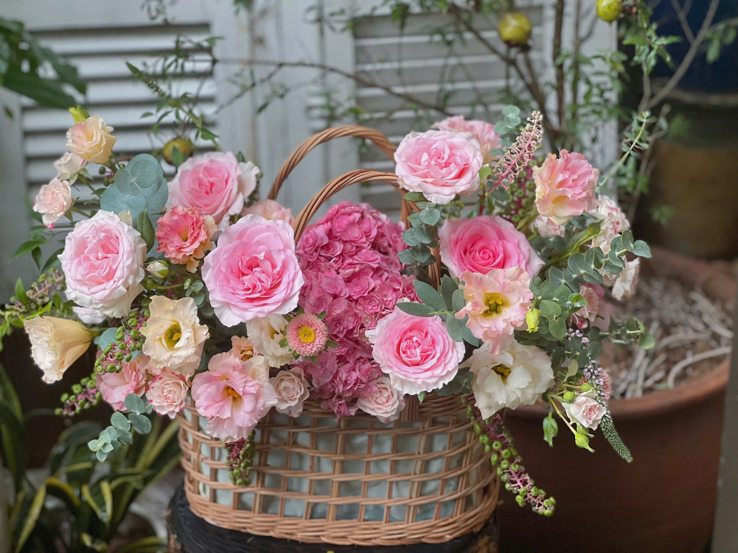 Một lời thì thầm của khu vườn hồng, nơi Rose (hoa hồng) pastel và Hydrangea (cẩm tú cầu) hồng phớt khẽ nghiêng mình trong làn nắng dịu. Giỏ hoa mang hương sắc của sự ngọt ngào và bình yên, như bản nhạc êm đềm gửi đến trái tim yêu thương.