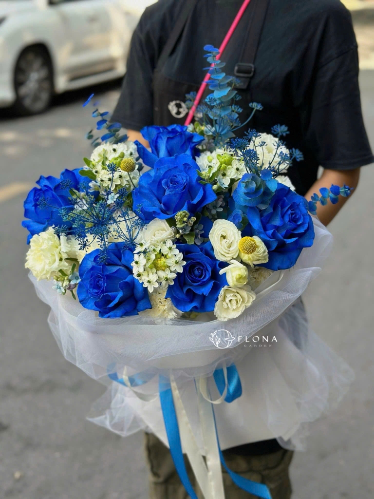 Blue Dream – giấc mơ xanh trong veo của nắng và gió, nơi những đóa Blue Rose (hoa hồng xanh) hòa cùng White Lisianthus (hoa cát tường trắng) và cành Eucalyptus (bạch đàn) dịu nhẹ. Bó hoa mang hơi thở của tự do, của những khát khao tươi sáng và bình yên như bầu trời sau cơn mưa.