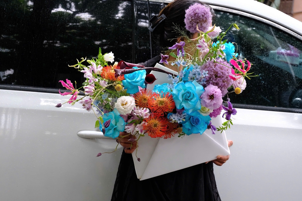 Bì thư hoa “Blue Promise” – lời hẹn ước trong sắc biếc: hồng xanh, pincushion cam, allium tím, gloriosa hồng, calla tím than, cát tường trắng, delphinium xanh và craspedia vàng. Sự hòa quyện rực rỡ giữa sắc lạnh và ấm, mang hơi thở hiện đại, mạnh mẽ mà vẫn đầy mộng mơ.