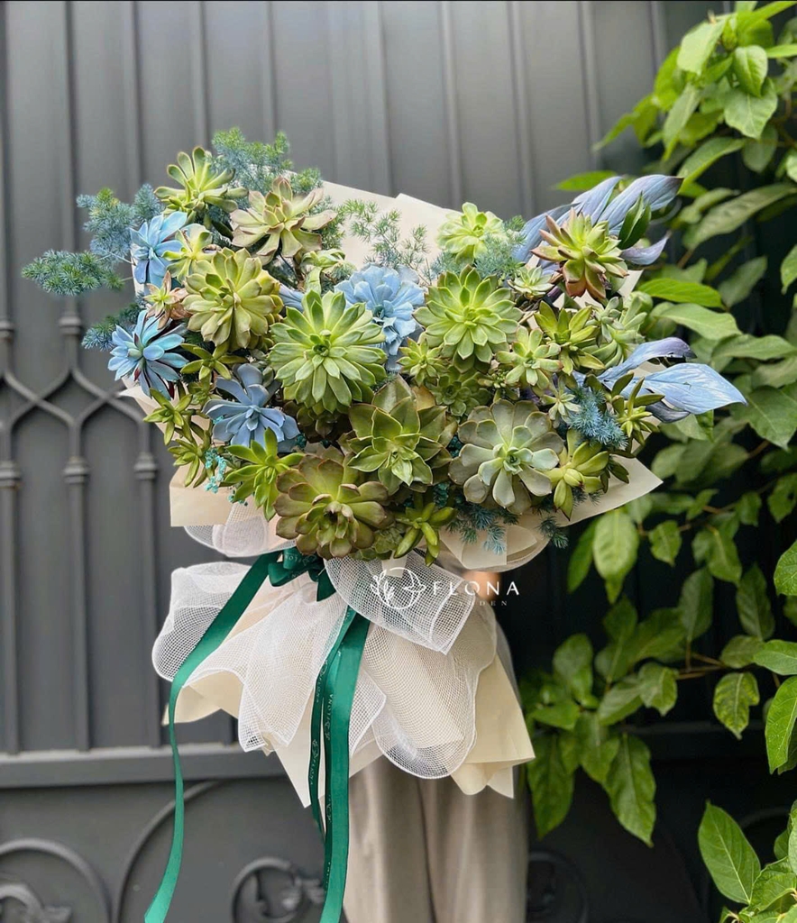 Một bản giao hưởng thanh tao giữa Echeveria (sen đá), Tillandsia (rêu không khí) và lá Asparagus Fern (dương xỉ tán mịn), hòa quyện trong sắc xanh lam dịu dàng và ánh bạc tinh khôi. Blue Serenade mang hơi thở của sự bình yên và sang trọng, như giai điệu nhẹ vang giữa khu vườn xanh mướt trong buổi sớm.