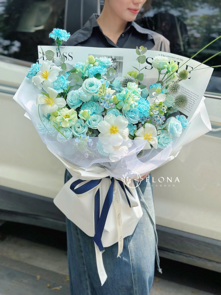 Blue Sky – tựa như chân trời xanh nơi bình minh vừa hé. Những cánh Lisianthus (hoa cát tường) xanh ngọc cùng Carnation (hoa cẩm chướng) và Lily (hoa loa kèn) trắng tinh khôi hoà quyện trong ánh sáng nhẹ, mang đến cảm giác an yên, tươi mới và đầy hy vọng.