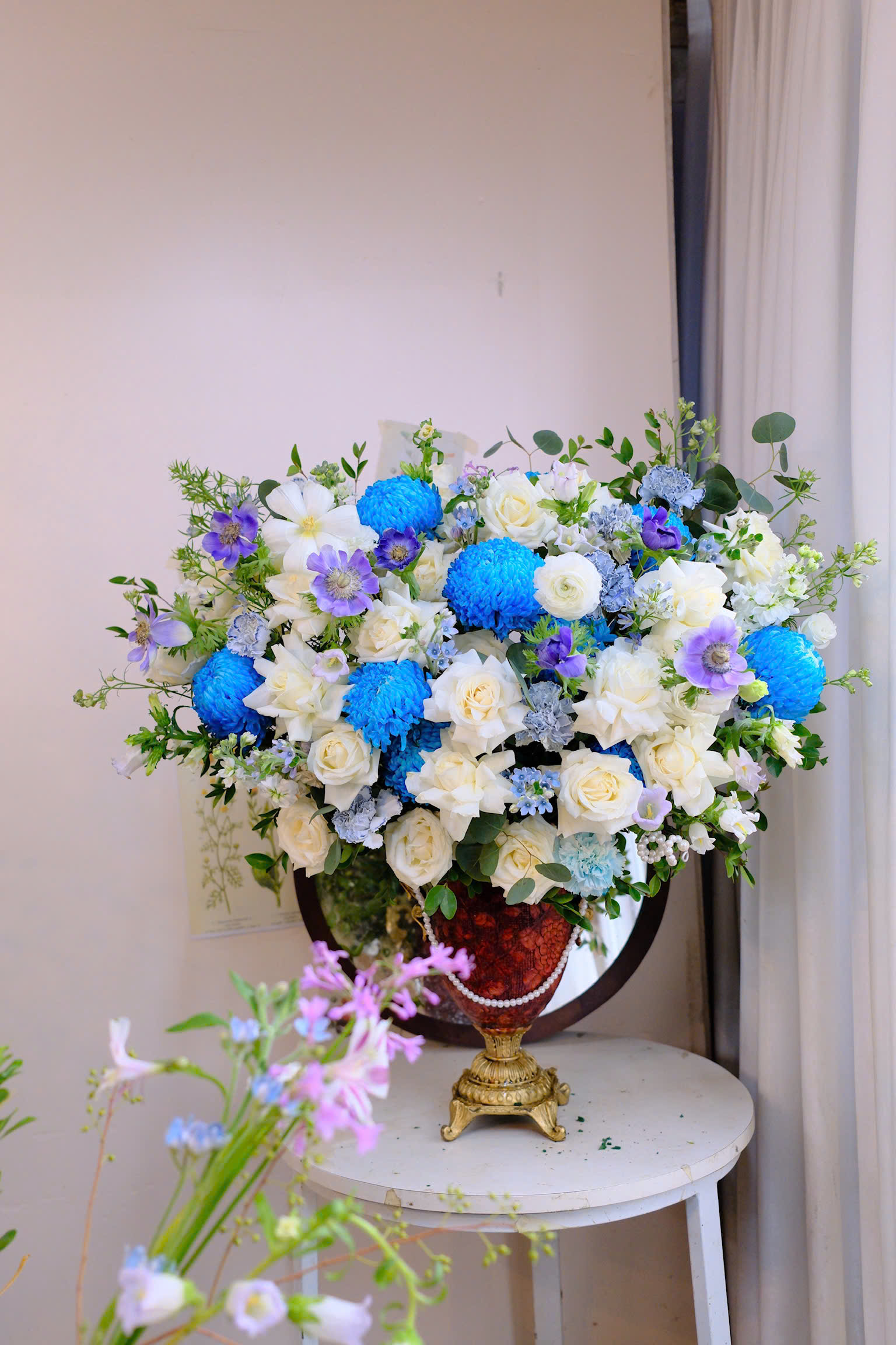 “Blue Whisper” – Bình hoa thanh thoát sắc lam: kết hợp rose (hoa hồng trắng kem), chrysanthemum (cúc mẫu đơn xanh lam), anemone (hoa hải quỳ tím nhạt), delphinium (hoa phi yến lam nhạt), carnation (cẩm chướng trắng), điểm eucalyptus (lá khuynh diệ...