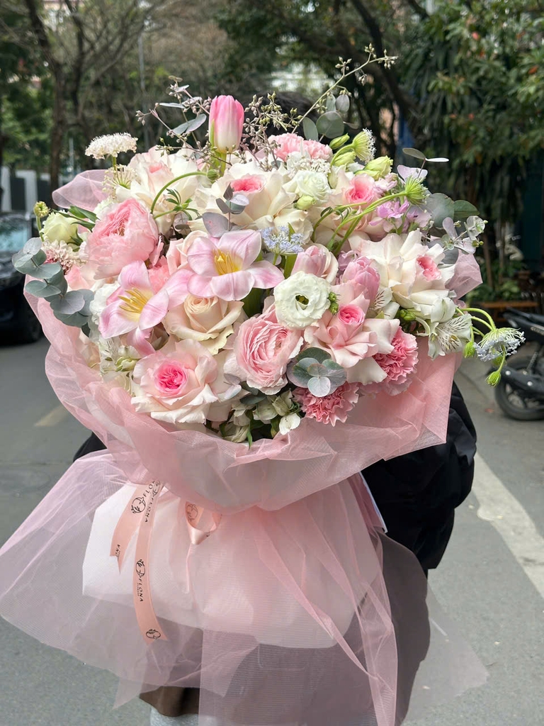 Blushing Cloud – bó hoa như đám mây hồng mơ màng, quyện giữa Pink Tulip (tulip hồng) và Garden Rose (hồng Đà Lạt) cùng những cánh Lisianthus (hoa cát tường) mềm mại. Sắc hồng phấn nhẹ tựa hơi thở mùa xuân, mang lại cảm giác ngọt ngào và tinh khôi như buổi sớm đầu ngày.