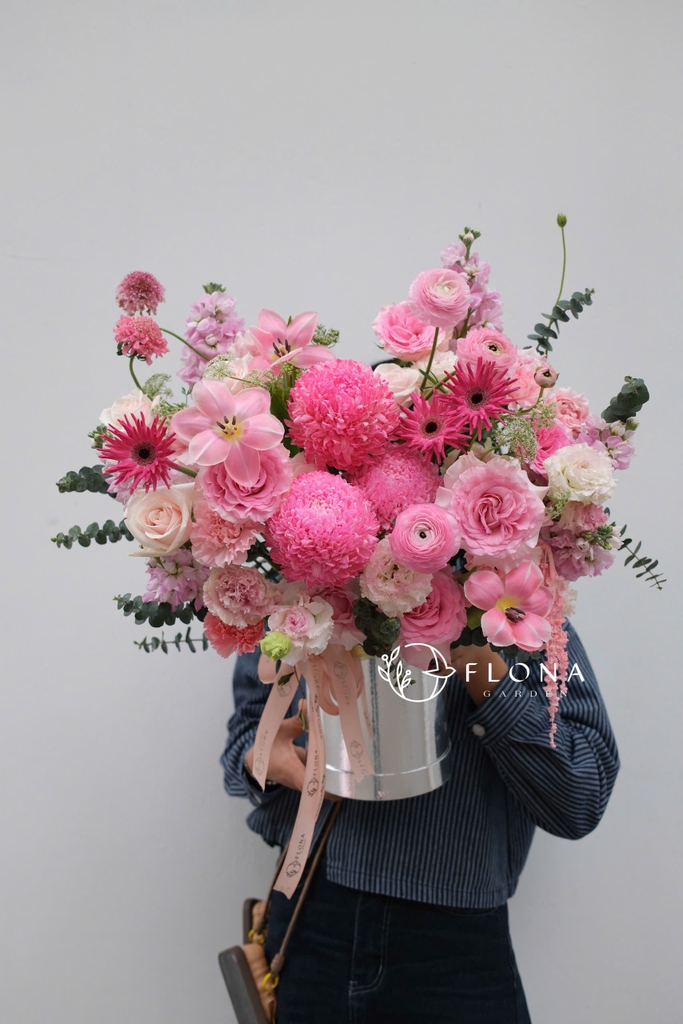 Blushing Melody là khúc nhạc dịu dàng của sắc hồng phấn và trắng ngà. Những cánh Tulip (hoa tulip) khẽ chạm vào Rose (hoa hồng) và Chrysanthemum (cúc mẫu đơn), tạo nên bản hòa âm ngọt ngào và trong trẻo. Hộp hoa như lời thì thầm của trái tim e ấp, gửi gắm yêu thương tinh khôi đến người nhận.