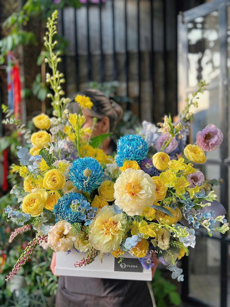 Brise d’Été là hộp hoa rực rỡ sắc vàng và xanh lam, kết hợp giữa Ranunculus (mao lương), Chrysanthemum (cúc mẫu đơn), Peony (mẫu đơn) và Lisianthus (cát tường). Sự hòa quyện giữa ánh vàng của nắng và sắc xanh của trời mang đến cảm giác tươi mới, dịu mát như làn gió mùa hạ khẽ chạm qua khu vườn buổi sớm.