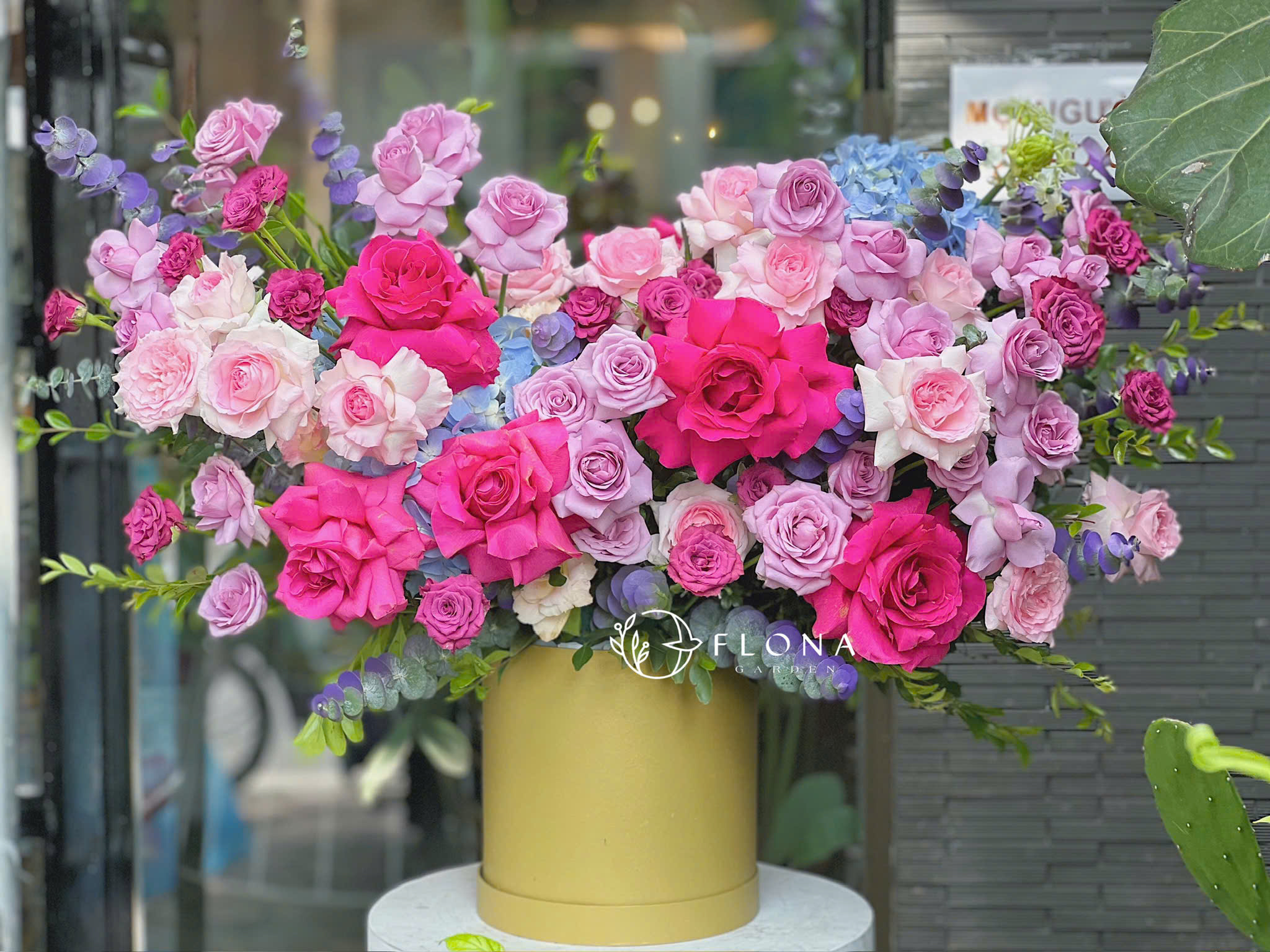 Chanson Lilac là hộp hoa mang sắc hồng fuchsia, tím lilac và pastel, kết hợp giữa Rose (hoa hồng) và Hydrangea (cẩm tú cầu). Một khúc hát ngọt ngào và lãng mạn, tựa làn sương hồng buổi sớm, gợi cảm giác yêu thương và rạng rỡ.