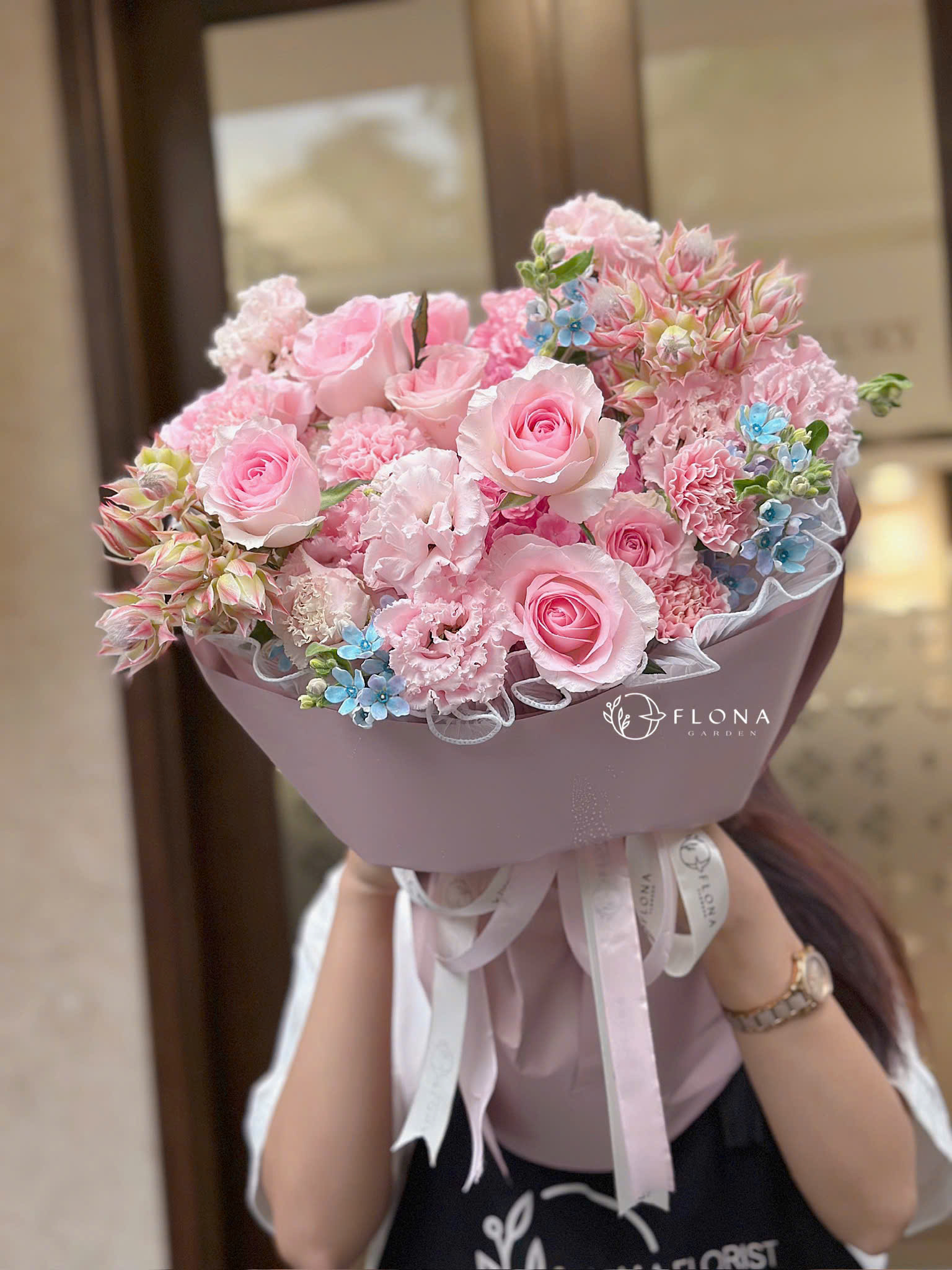 "Cotton Candy" là làn mây hồng phủ đầy yêu thương, nơi Rose (hoa hồng pastel) và Carnation (hoa cẩm chướng hồng) đan xen cùng Forget-me-not (hoa lưu ly xanh).