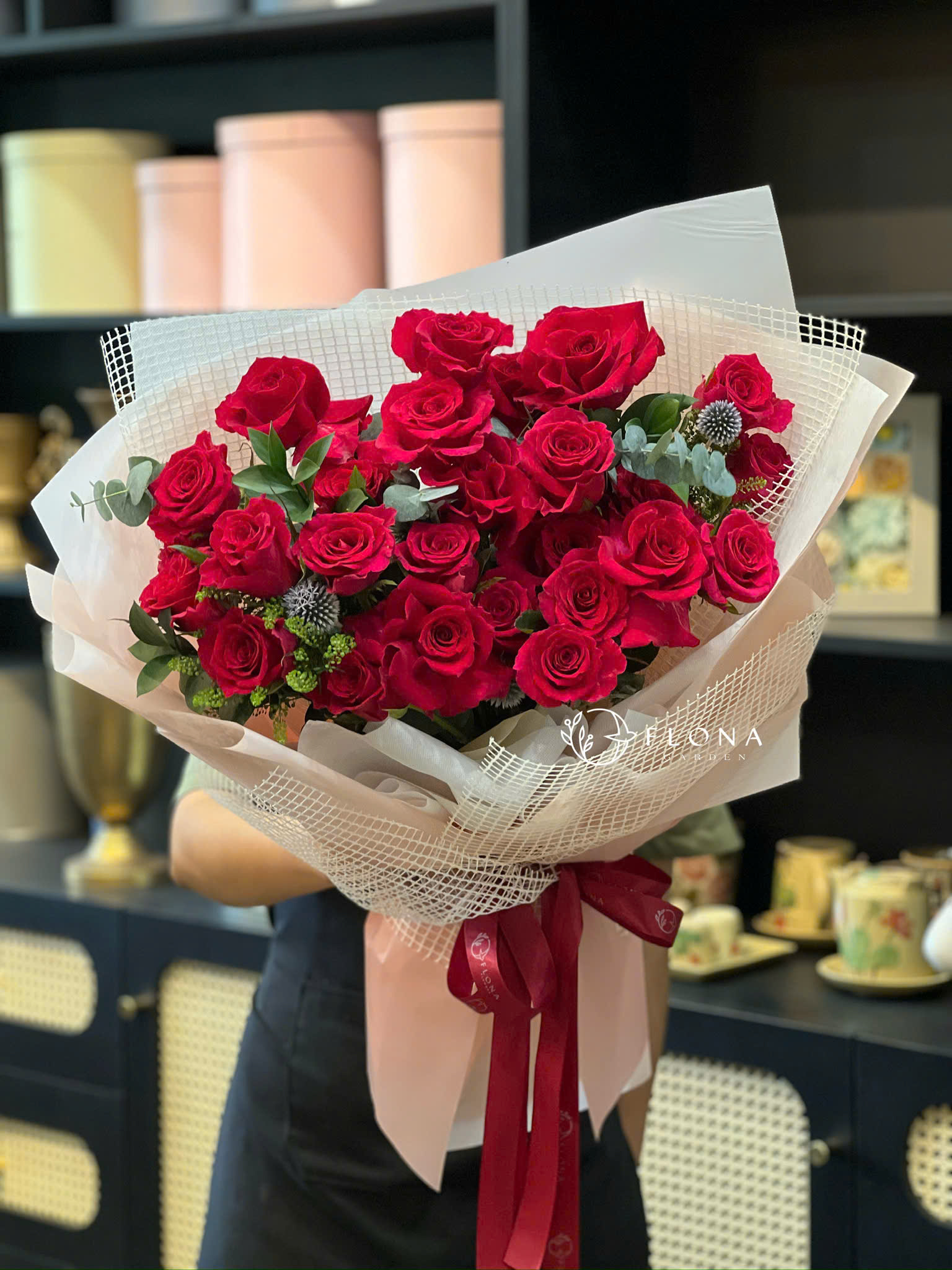 Crimson Love – biểu tượng của tình yêu nồng cháy và chân thành. Những đóa Rose (hoa hồng) đỏ thắm khoe sắc giữa làn lá Eucalyptus (bạch đàn) xanh mướt, tạo nên vẻ đẹp vừa cổ điển vừa quyến rũ. Bó hoa như lời tỏ tình ngọt ngào, dành cho những trái tim đang yêu và dám yêu hết mình.