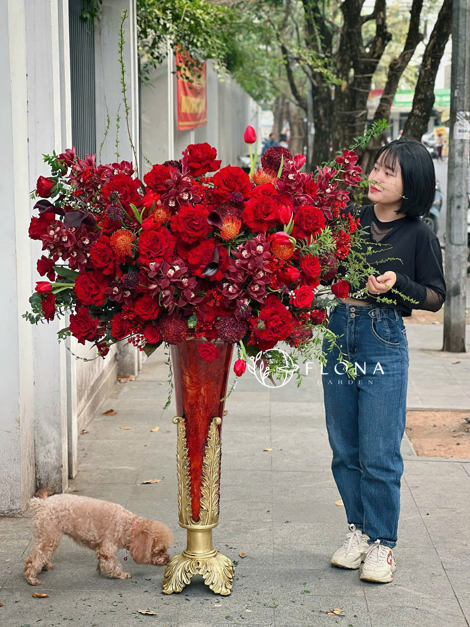 Sắc đỏ cháy bỏng của Crimson Muse mang hơi thở của sự kiêu hãnh và đam mê. Bình hoa là bản hòa quyện của hoa hồng đỏ, tulip đỏ, lan mokara (lan Mộc Lan Thái), Ánh Trăng và pincushion (kim cầu Châu Phi), điểm xuyết eucalyptus (lá bạch đàn) – tạo nên một tác phẩm vừa sang trọng, vừa rực rỡ như ngọn lửa tình yêu.