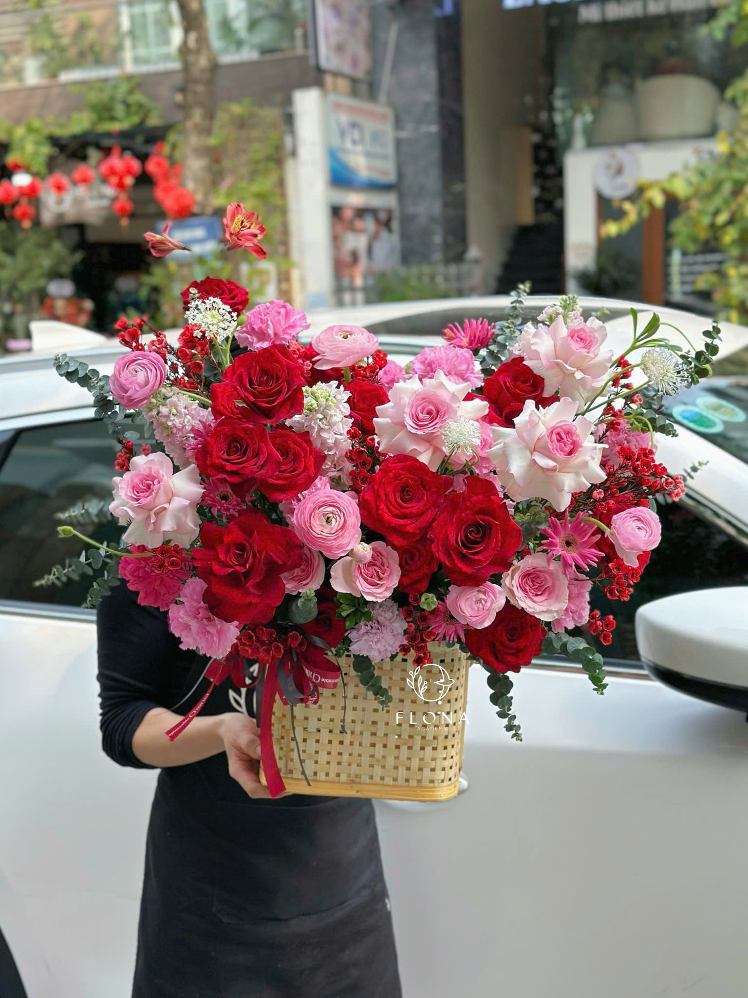 Giỏ hoa tựa điệu valse đỏ thắm, xoay tròn giữa sắc Rose (hoa hồng) đỏ ruby, Ranunculus (mao lương) hồng phấn và Alstroemeria (hoa lily Peru) cam nhẹ. Từng cánh hoa hòa nhịp cùng ánh sáng, vẽ nên bản tình ca nồng nàn và kiêu sa.