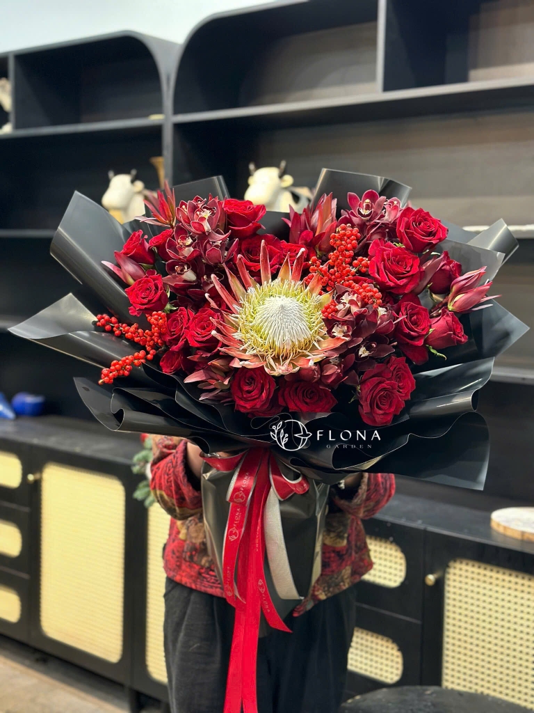 Sang trọng và quyền lực, Crown Majesty là bản hòa tấu giữa Red Roses (Hoa hồng đỏ), Cymbidium Orchid (Hoa lan cymbidium) và King Protea (Hoa chuối thiên điểu Nam Phi). Sắc đỏ trầm quyện cùng vàng nhạt của Protea gợi cảm giác kiêu hãnh và huy hoàng – như một vương miện rực rỡ dành cho người xứng đáng được tôn vinh.