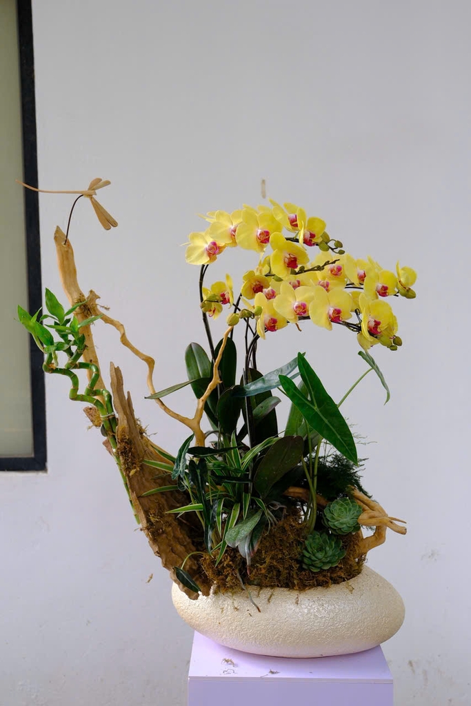 Golden Prestige – biểu tượng của vị thế và thành công, mang sắc vàng rực rỡ của Phalaenopsis Orchid (lan hồ điệp) hòa cùng mảng xanh quý phái của Succulent (sen đá). Thiết kế vươn cao đầy kiêu hãnh, như lời chúc phúc cho những bước tiến thăng hoa và thành đạt.