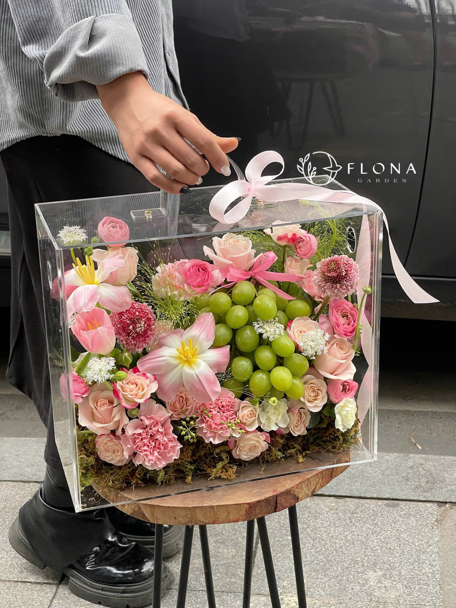 Như hơi thở trong vắt của sương mai, hộp hoa mang sắc nhẹ nhàng của Rose (hoa hồng) hồng phấn, Phalaenopsis (lan hồ điệp) trắng ngà và Echeveria (sen đá) xanh bạc. Trong chiếc hộp mica trong suốt, mỗi cánh hoa như khẽ lay động dưới ánh sáng – thuần khiết, thanh tao và đầy tinh tế.