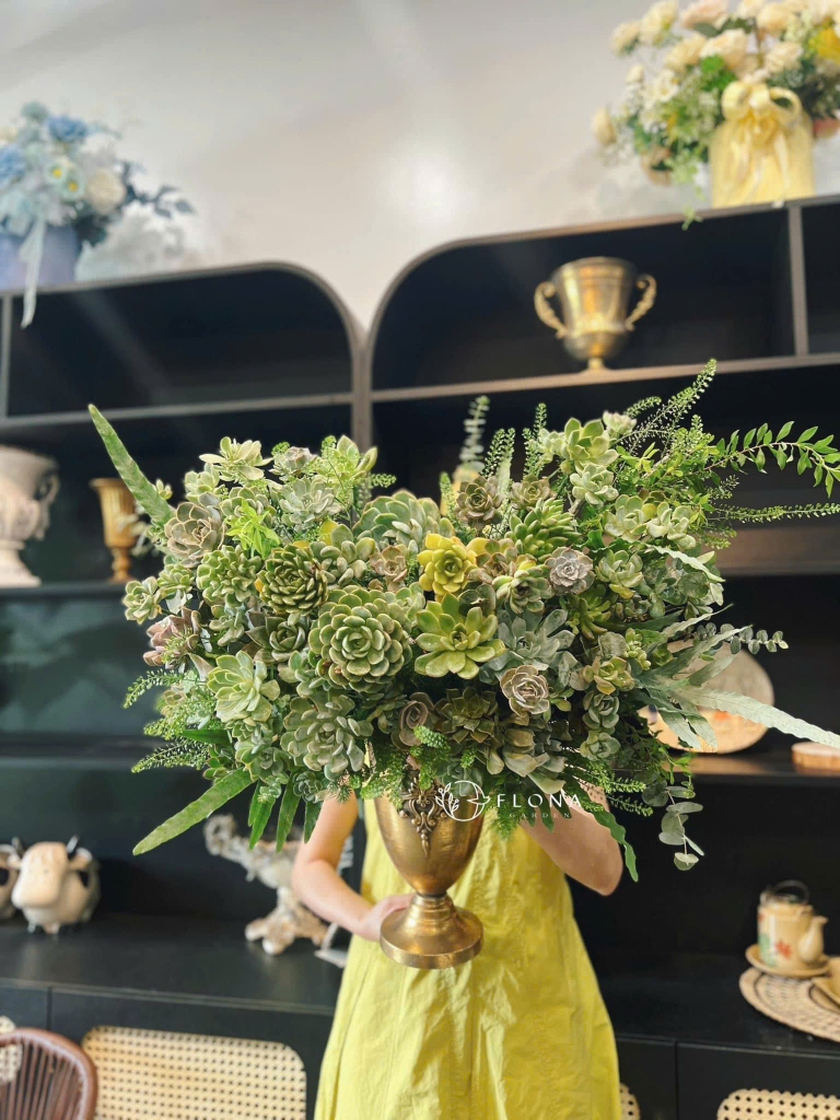 “Emerald Oasis” – Bình sen đá nghệ thuật: hòa điệu echeveria (sen đá bông hồng), crassula, sedum variegata, haworthia, điểm rhipsalis, dương xỉ và eucalyptus bạc. Một ốc đảo xanh mát, hiện đại và thanh sạch—hoàn hảo cho bàn làm việc, không gian sang trọng.