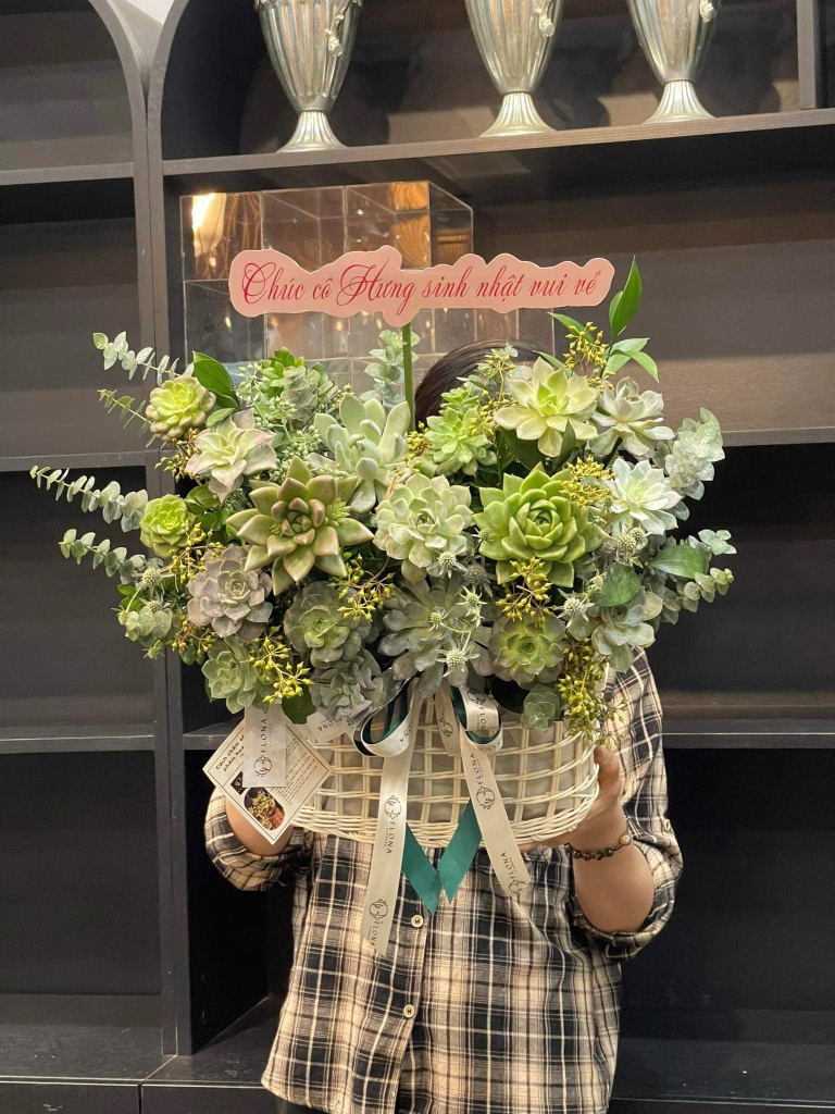 Tựa như khu vườn thu nhỏ giữa sương mai, “Emerald Serenity” mang vẻ tĩnh lặng mà thanh khiết với những cụm Succulent (sen đá), Eucalyptus (bạch đàn) và điểm xuyết vài nhánh Thistle gai mềm – tượng trưng cho sức sống bền bỉ và vẻ đẹp thuần khiết. Một món quà thanh nhã dành cho người yêu thiên nhiên và sự tinh tế.
