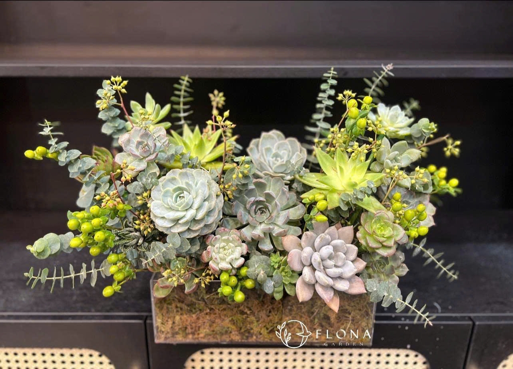 “Emerald Whisper” mang sắc xanh thanh mát của Succulent (sen đá) kết hợp cùng Eucalyptus (bạch đàn) và quả Hypericum (cúc ngọc trâm). Bố cục tự nhiên, sang trọng như khu vườn nhỏ thì thầm giữa ánh nắng sớm – một món quà đầy tinh tế và an lành.