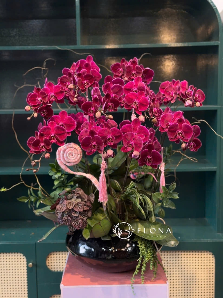 Empress Elegance – mang vẻ đẹp quyền quý và tinh tế của một nữ vương. Sắc tím đậm quyến rũ của Phalaenopsis Orchid (lan hồ điệp) hòa quyện cùng đường cong mềm mại của dây trang trí và mảng xanh tươi mát, tạo nên tổng thể sang trọng, hiện đại và đậm dấu ấn
