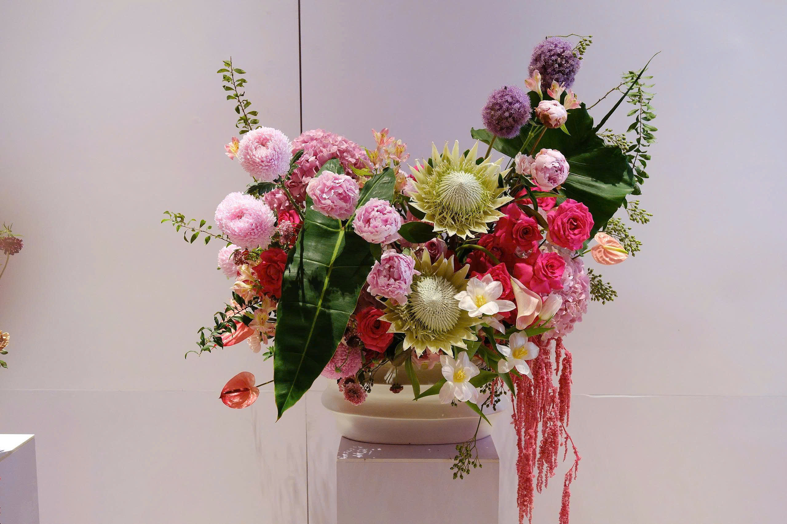 Ethereal Bloom – Một bản hòa ca nhẹ nhàng giữa sắc hồng và xanh dịu, được tạo nên từ hồng dâu ngọt ngào, protea (chuỗi ngọc Nam Phi) kiêu sa, allium (tỏi kiểng) tím thanh tao, xen lẫn anthurium (hồng môn), freesia (dạ lan hương) và chrysanthemum (cúc mẫu đơn). Tựa như khúc mộng mơ giữa vườn xuân, nơi từng cánh hoa nở rộ mang theo hơi thở của sự thanh khiết và hạnh phúc vẹn tròn.