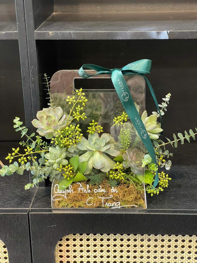 Everlyn – hộp sen đá xanh thanh mát, hòa sắc cùng eucalyptus và trái mọng Hypericum. Mỗi nhánh lá, mỗi cánh sen đều như mang hơi thở của khu vườn bình yên, nơi sự bền vững và an nhiên cùng tồn tại.