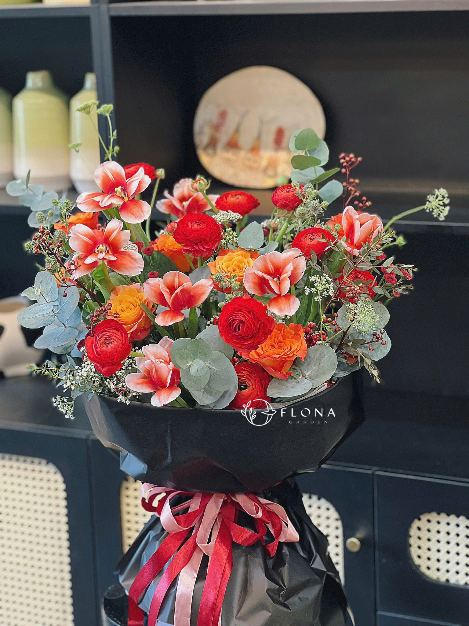 Fiery Sonata là bản hòa ca rực rỡ giữa sắc Tulips (Hoa tulip) đỏ cam, Ranunculus (Hoa mao lương) đỏ tươi và Roses (Hoa hồng cam) ấm áp. Mỗi cánh hoa như một nốt nhạc bốc lửa, mang trong mình năng lượng, đam mê và sức sống mãnh liệt. Bó hoa được phối trên nền lá bạc và giấy gói đen sang trọng – tượng trưng cho sự tự tin, kiêu hãnh và tình yêu nồng cháy.