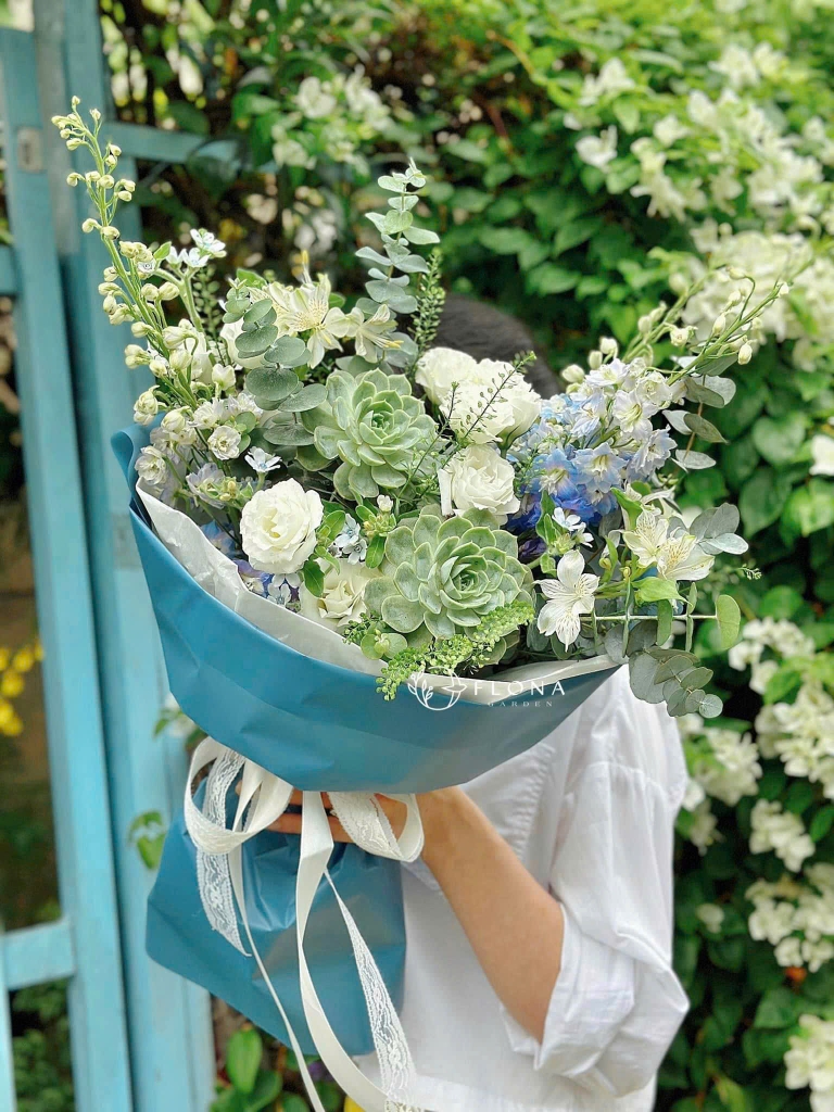 Garden Whisper là khúc thì thầm nhẹ như gió, được dệt nên từ sắc xanh thanh mát của Succulent (Sen đá), Delphinium (Hoa phi yến) và Alstroemeria (Lily Peru) trắng dịu dàng. Màu xanh lam tựa như bầu trời sau mưa, trong trẻo và an yên, còn sắc trắng là chút nắng đầu ngày len qua tán lá – nhẹ nhàng mà sâu lắng. Mỗi nhánh hoa như kể về những khoảng lặng bình yên trong tim, khi người ta tìm thấy sự tĩnh tại giữa nhịp sống hối hả.