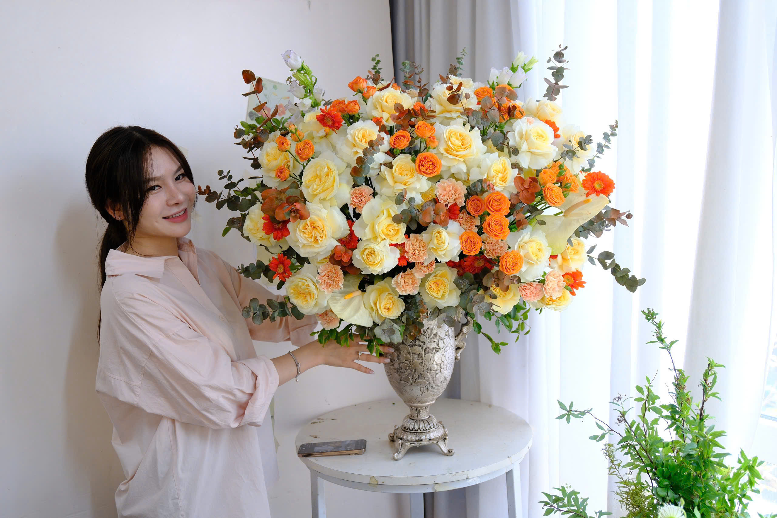 “Golden Dawn” – Bình hoa rực nắng: hòa sắc hồng vàng champagne, cúc cam, cẩm chướng đào, mini rose cam, điểm lá eucalyptus nâu. Gam vàng – cam rực rỡ như buổi bình minh tràn đầy năng lượng, mang ý nghĩa khởi đầu tươi sáng và thành công viên mãn.
