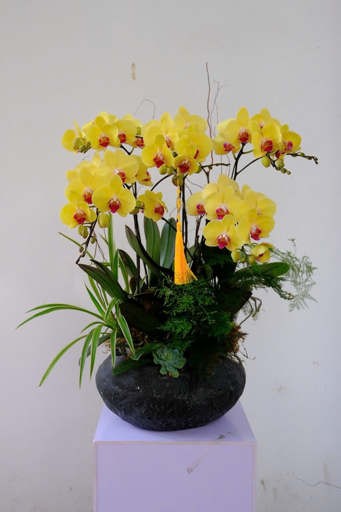 Tựa ánh vàng rực rỡ của thành công được lưu dấu qua thời gian, Golden Legacy mang vẻ đẹp phú quý của Phalaenopsis Orchid (lan hồ điệp) vàng óng. Mỗi cánh hoa mở ra như biểu tượng của may mắn, thịnh vượng và khởi đầu bền vững. Sắc vàng quyền quý hòa cùng mảng xanh tự nhiên và chậu đá trầm tĩnh, tạo nên tổng thể sang trọng – tôn vinh phong thái điềm đạm, tinh tế và đẳng cấp của người doanh nhân thành đạt.