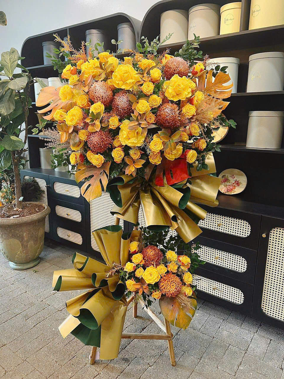 Golden Overture mang sắc vàng rực rỡ của Rose (hoa hồng) và Chrysanthemum (cúc mẫu đơn), điểm xuyết cùng tán lá ánh đồng. Kệ hoa như khúc mở đầu tràn đầy vinh quang – gửi gắm lời chúc khai trương hưng thịnh, tài lộc và rạng rỡ như ánh ban mai vàng son.