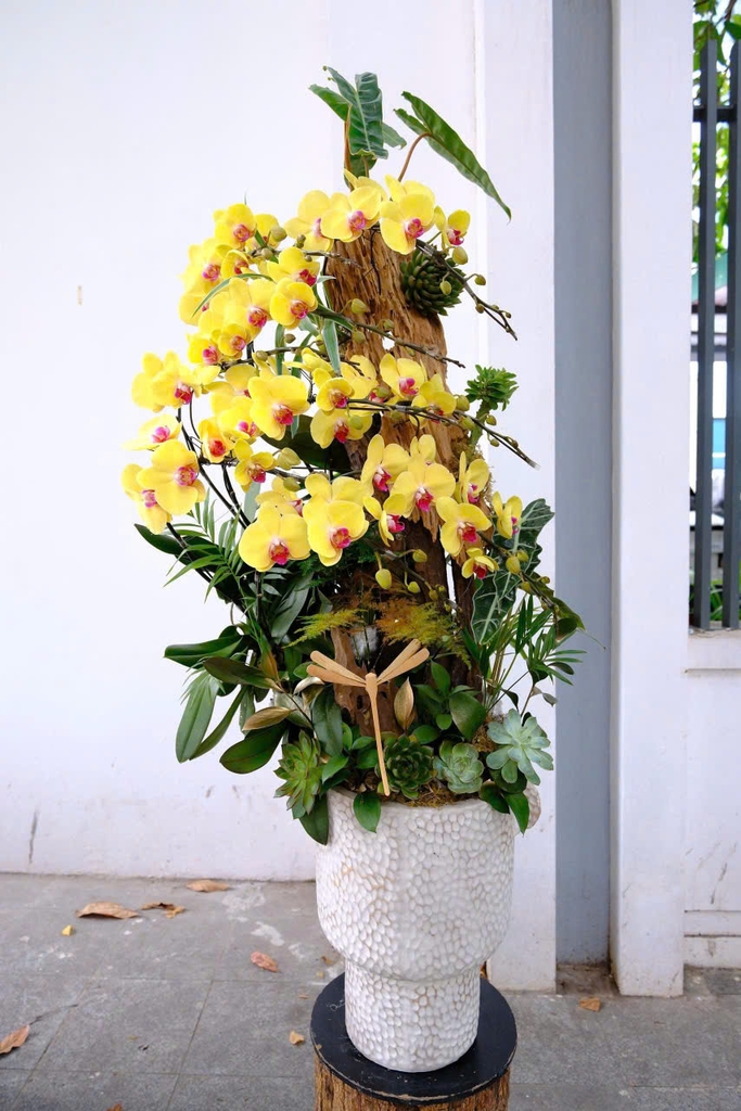 Golden Pinnacle là biểu tượng của thành công và thịnh vượng. Cụm Phalaenopsis Orchid vàng rực vươn cao quanh thân gỗ, tựa dòng năng lượng bừng sáng dẫn lối đến đỉnh cao danh vọng.