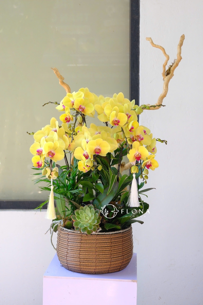 Một tác phẩm mang đậm tinh thần thịnh vượng và đẳng cấp, Golden Prestige tỏa sáng với sắc vàng rực rỡ của Phalaenopsis Orchid (lan hồ điệp) – biểu tượng của thành công và danh vọng. Những cành hoa nở đều, uốn cong nhẹ nhàng quanh nhánh gỗ tự nhiên, tượng trưng cho sự thăng tiến bền vững. Điểm xuyết Succulent Plant (sen đá) xanh trầm và tua lụa trắng tinh khôi, tổng thể tạo nên vẻ đẹp sang trọng, hài hòa – hoàn hảo cho không gian doanh nhân thanh lịch.