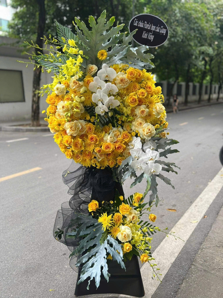 Tựa như ánh hoàng hôn rơi trên miền ký ức, kệ hoa Golden Reminiscence rực lên sắc vàng ấm của yellow rose (hoa hồng vàng) và white orchid (lan hồ điệp trắng). Giữa dải voan đen lặng lẽ, từng đóa hoa khẽ kể câu chuyện về sự ly biệt – buồn thương mà thanh khiết, như lời tiễn đưa đong đầy yêu thương và trân trọng cuối cùng.