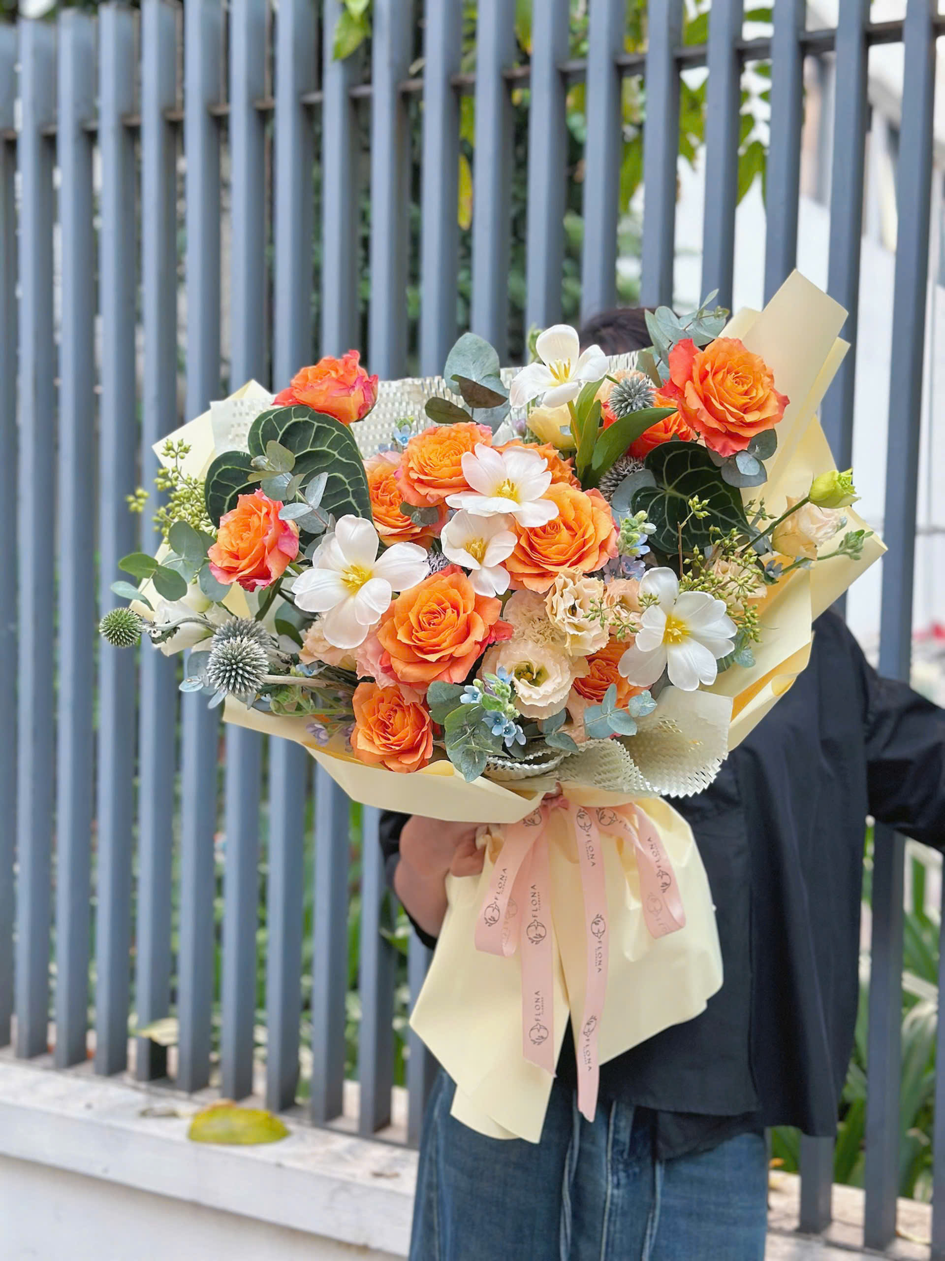 "Golden Sonate" tái hiện khoảnh khắc đẹp nhất của ngày – nơi ánh nắng vàng ôm trọn sắc Rose (hoa hồng cam vàng) và Freesia (hoa lan chuông trắng).