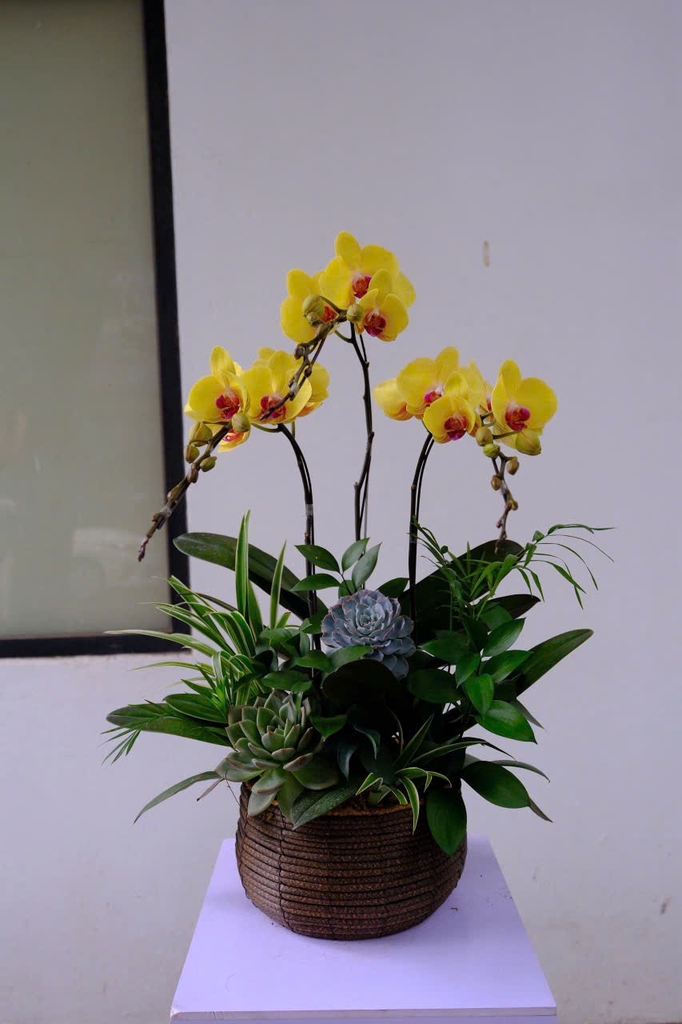Rực rỡ và đầy khí chất, Golden Triumph là biểu tượng của thành công bền vững. Sắc vàng kiêu hãnh của Phalaenopsis Orchid (lan hồ điệp) kết hợp cùng Echeveria Succulent (sen đá echeveria) mang thông điệp thịnh vượng và khởi sắc. Từng đường cong của cánh hoa như ánh dương chiếu sáng hành trình vươn tới đỉnh cao của người doanh nhân bản lĩnh.