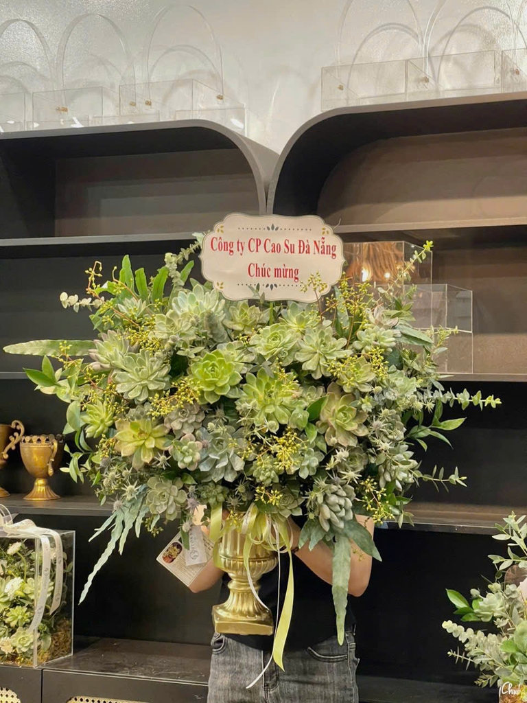 “Green Majesty” – Bình sen đá sang trọng: kết hợp echeveria, crassula, haworthia, sedum, điểm lá eucalyptus, lá dương xỉ và cỏ vàng mimosa. Sắc xanh tầng tầng lớp lớp mang hơi thở thiên nhiên và biểu trưng cho sự thịnh vượng, bền vững – món quà hoàn hảo cho khai trương, tri ân, và không gian hiện đại.