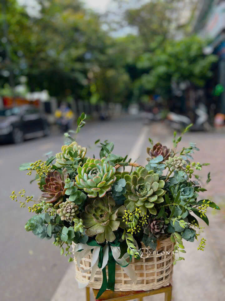 Giỏ “Whispering Garden” phủ sắc xanh thanh khiết, dịu mát từ Echeveria (sen đá), điểm nhấn những nhánh Eucalyptus (bạch đàn) và chấm xinh Hypericum berries (trái tăng phúc). Một khu vườn thì thầm, tinh tế và thư thái cho ngày đẹp dịu dàng