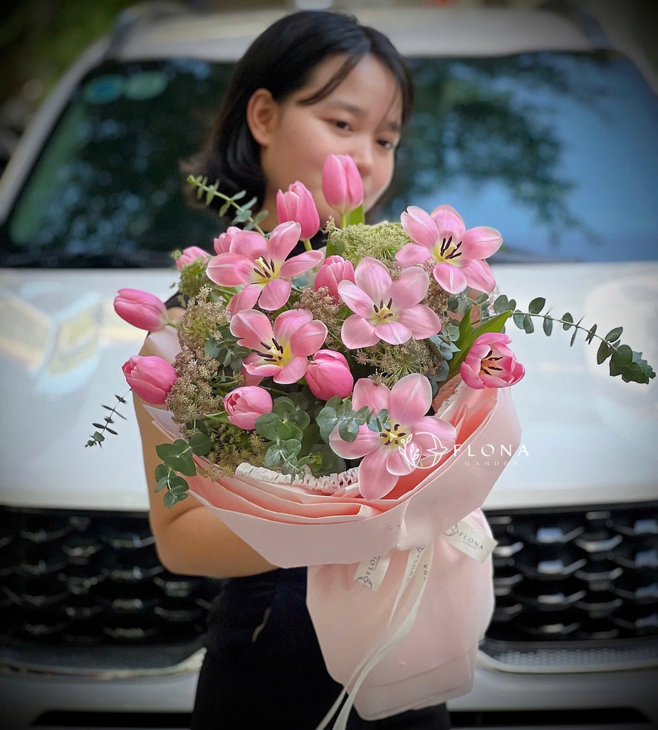 Ngọt ngào và trong trẻo như cái ôm đầu xuân, Blushing Spring mang sắc hồng dịu dàng của Pink Tulips (Hoa tulip hồng) hòa cùng chút xanh mướt từ Eucalyptus (Lá bạch đàn). Từng bông tulip mở khẽ như lời chào của mùa mới — tươi tắn, nữ tính và tràn đầy hy vọng. Một bó hoa dành cho những tâm hồn yêu sự nhẹ nhàng và thanh khiết.