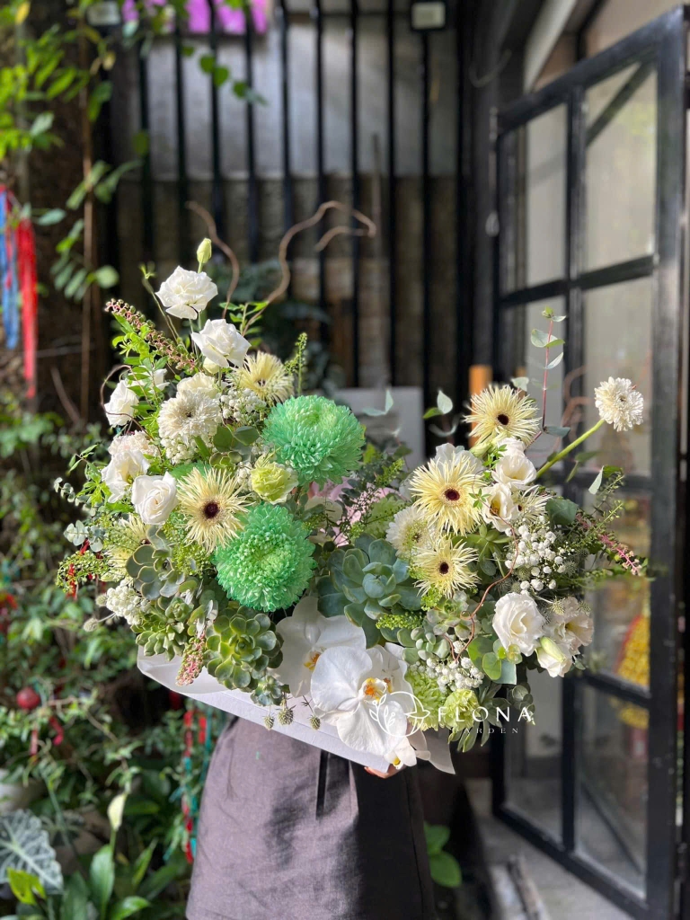 Jardin de Sérénité mang sắc xanh ngọc tươi mát của Chrysanthemum (hoa cúc mẫu đơn tròn) hòa cùng trắng tinh khôi từ Orchid (lan hồ điệp) và Lisianthus (cát tường). Hộp hoa gợi cảm giác yên bình, trong trẻo – như khu vườn ban mai sau cơn mưa nhẹ, nơi mọi điều trở nên dịu dàng và thuần khiết.