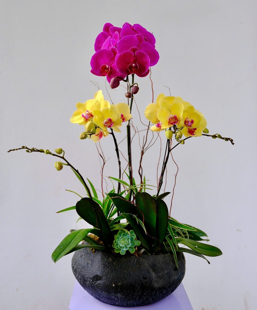 Sự hòa quyện giữa quyền quý và thịnh vượng, Legacy of Prosperity tỏa sáng với sắc tím sang trọng và vàng phú quý của Phalaenopsis Orchid (lan hồ điệp). Hai gam màu đối lập cùng vươn lên trong thế cân bằng, tượng trưng cho trí tuệ và tài vận song hành. Điểm xuyết Succulent Plant (sen đá) xanh trầm – biểu trưng cho sự bền vững và trường tồn – tạo nên một tổng thể đẳng cấp, xứng tầm không gian của người thành đạt.