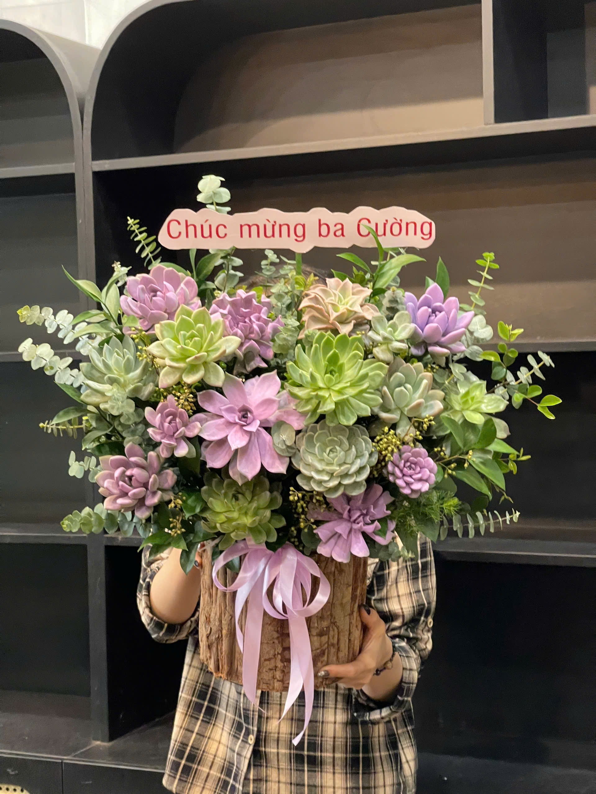 Tựa như một buổi sớm mùa xuân, giỏ hoa Lavender Garden hòa quyện giữa sắc sen đá (Echeveria – Sen đá) xanh mướt và hoa lan đá tím (Graptopetalum – Lan đá) dịu dàng. Những nhánh khuynh diệp (Eucalyptus – Bạch đàn) và chùm bi (Brunia – Chùm bi xám) điểm xuyết khéo léo, mang hơi thở của thiên nhiên an lành.