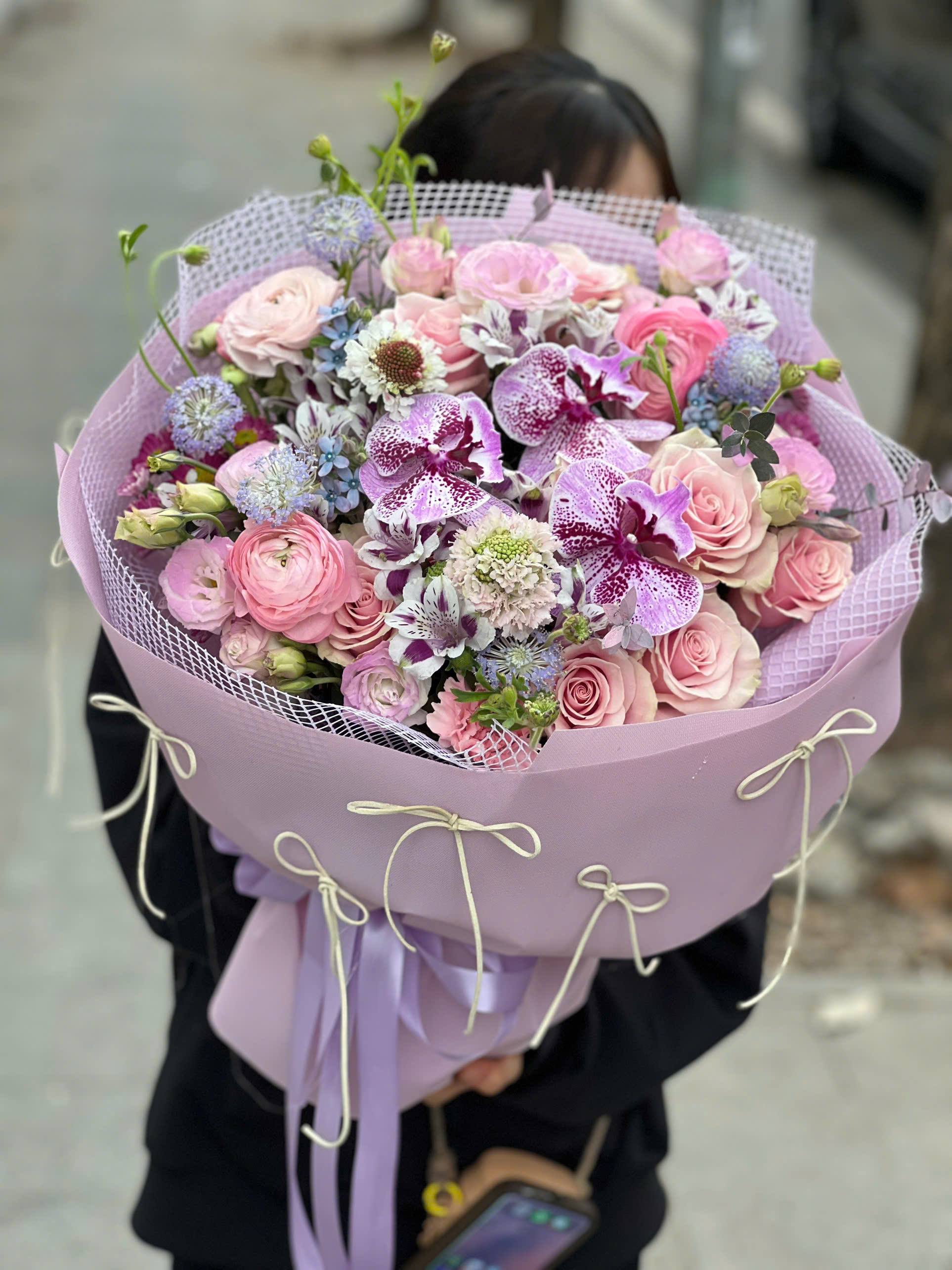Những cánh Orchid (hoa lan)Ranunculus (hoa mao lương) đan xen cùng Rose (hoa hồng) – tạo nên bức tranh nên thơ, sang trọng và đầy quyến rũ.