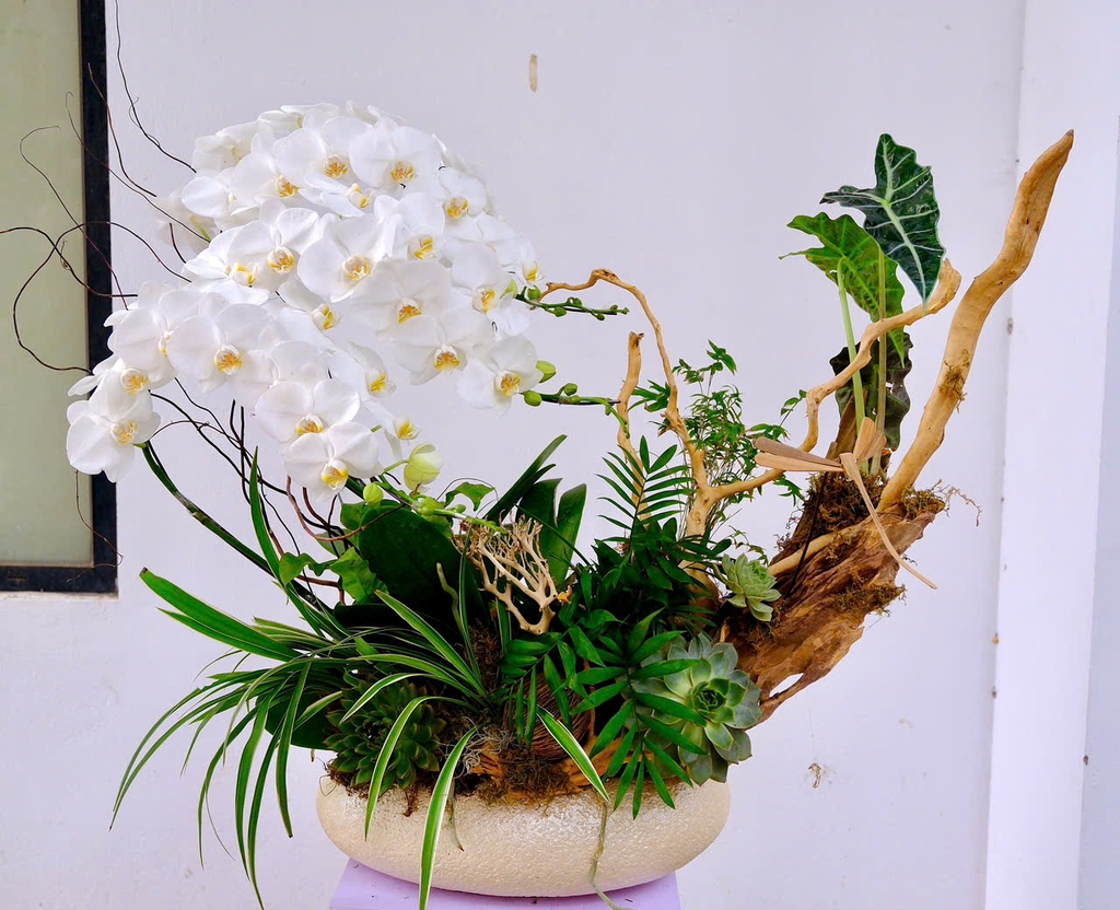 Bố cục kết hợp hài hòa giữa đường gỗ tự nhiên và mảng xanh của Succulent (sen đá), biểu trưng cho sức sống bền bỉ, sự phát triển không ngừng – món quà hoàn hảo gửi tặng người thành công, với lời chúc phúc cho sự nghiệp thăng hoa và tâm thế an nhiên.
