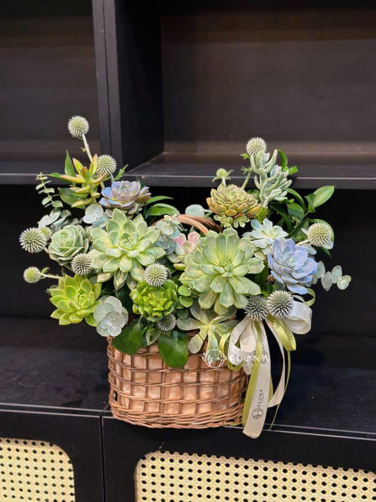 Lush Haven – một bản hòa ca của sắc xanh tươi mát và thanh khiết. Giỏ hoa kết hợp Echeveria (sen đá), Echinops (cúc bi xanh) và Eucalyptus (bạch đàn), tạo nên bố cục tự nhiên mà sang trọng. Những tầng lá đan xen, xen lẫn sắc bạc và xanh olive nhẹ, như hơi thở của khu vườn sau cơn mưa. Một món quà giản dị mà đầy tinh tế – dành cho người yêu thiên nhiên, yêu sự bình yên và vẻ đẹp thuần khiết.