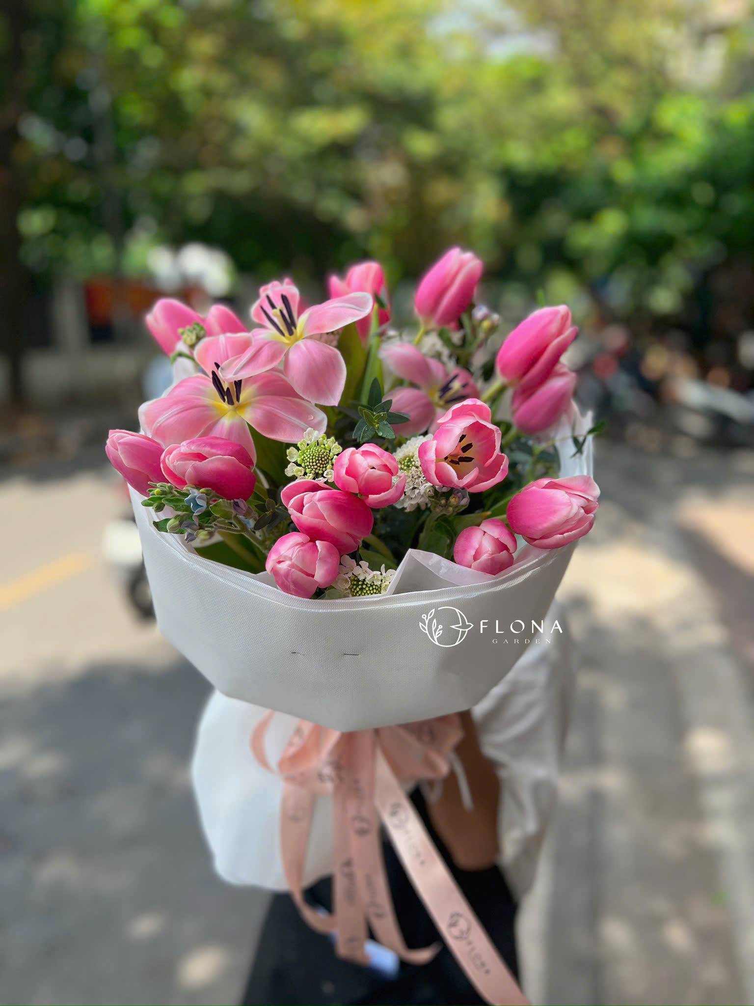 Như vòng tay ấm áp của mùa xuân, "Lyli Embrace" là sự kết hợp tinh tế giữa Tulip (hoa tulip hồng) và Lily (hoa ly phấn hồng).