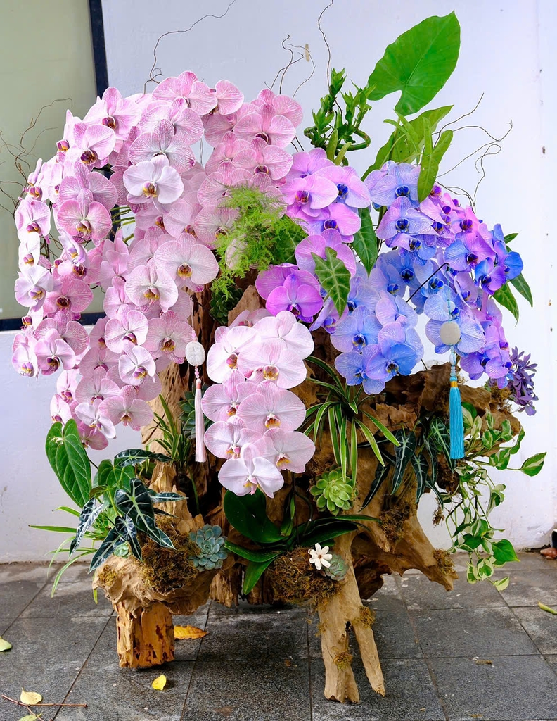 Majestic Horizon – đường chân trời của ánh sáng và sắc màu. Những cánh Dyed Phalaenopsis Orchid (lan hồ điệp nhuộm hồng – tím – lam) uốn cong mềm mại như dải cầu vồng rực rỡ sau mưa, biểu trưng cho hạnh phúc trọn vẹn và sự thịnh vượng trường tồn. Một tác phẩm độc bản, mang thần thái quý phái, chúc phúc cho những khởi đầu viên mãn và hành trình thành công không giới hạn.